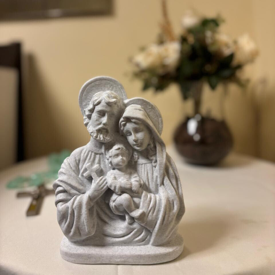 Uma representação tocante do amor divino e da união familiar. Nesta escultura, Maria e José acolhem com ternura o Menino Jesus, expressando proteção, afeto e fé. Com halos suaves e traços delicados, essa peça é ideal para trazer serenidade e espiritualidade ao lar.